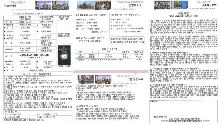 4월5일(주일) | 부활주일/부활절 새벽기도회/부활절 칸타타/ 기관별 찬양대회(오후예배시) |