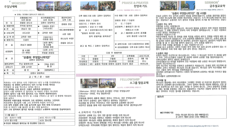 예배 후 모임- 월례회(본당)/ 유초등부(유초등부실)/ 중고등부(중.고등부실)